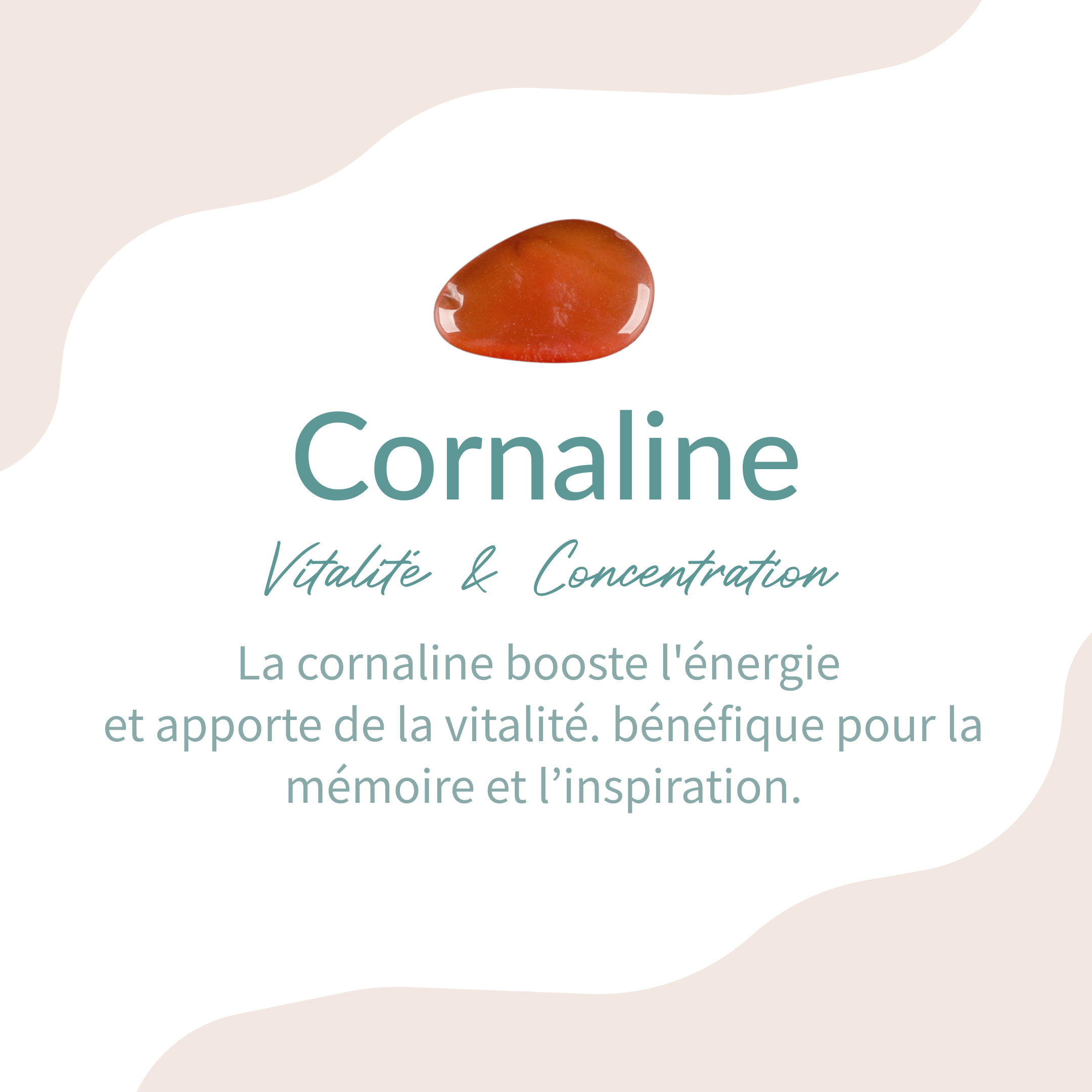 •   La cornaline confère de la stabilité, courage et fera place aux énergies positives.